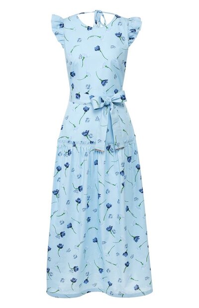 Голубое платье из весенне-летней коллекции будет одинаково гармонично смотреться и с сандалиями на плоской подошве, и с босоножками на шпильке. Для пошива приталенной модели Маркус Люпфер выбрал тонкий дышащий хлопок с принтом, вдохновленным плывущими по воде цветами. Романтическое настроение вещи поддерживают расклешенный подол и широкие оборки вдоль пройм.