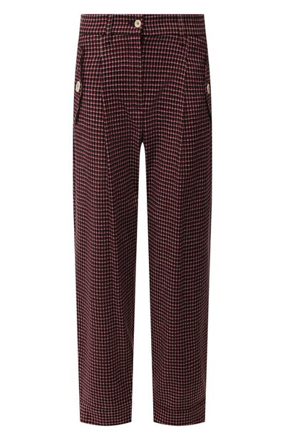 Красные брюки разнообразят повседневный комплект, например, состоящий из черной водолазки и туфель в тон. Все дело в том, что модель сделали длиной чуть ниже колена, а акцент на таком приеме получили широкими регулируемыми манжетами и защипами. Одежда из плотной клетчатой ткани, в которой сочетали мягкую шерсть и прочный полиамид, вошла в коллекцию сезона осень-зима.