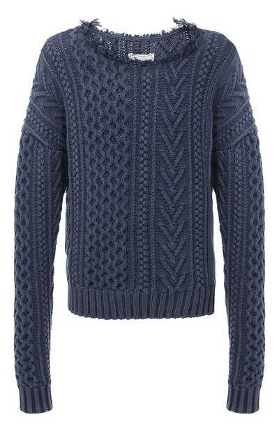 Свободный крой, выбеленный эффект и бахрома на круглой горловине, придающие вещи состаренный вид: темно-синий джемпер, связанный фактурным узором, станет идеальной основой образа в стиле гранж. Грег Лорен выбрал для изготовления модели мягкий хлопок. Этот приятный на ощупь материал хорошо пропускает воздух, поэтому в таком изделии из осенне-зимней коллекции будет комфортно весь день.