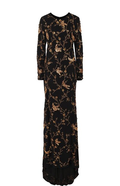 Наим Кан включил в осенне-зимнюю коллекцию черное платье из фактурного крепа. Мастера бренда вручную расшили шелковую ткань узором с цветами и птицами. Мерцающие золотистые пайетки и бисер особенно эффектно выглядят в движении. Модель дополнена драпировкой и шлейфом. В сочетании с обувью на шпильке и клатчем вещь с высоким разрезом станет идеальным вариантом для торжественного события.