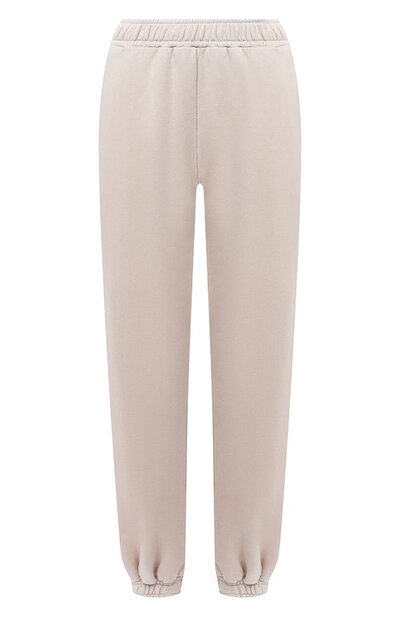 Для джоггеров из осенне-зимней коллекции нежный кремовый оттенок создали, смешав вручную несколько красок. Лаконичный крой только приковывает внимание к цвету. Изделие с посадкой на талии мастера марки сшили из плотного хлопкового футера, который поможет согреться в прохладную демисезонную погоду.