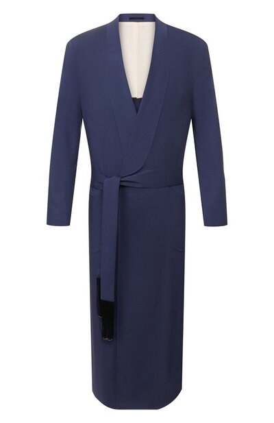 В коллекцию сезона весна-лето вошло пальто-халат приглушенного синего оттенка. Для создания модели с широкими фигурными лацканами мастера использовали легкую тонкую шерсть. За счет природных свойств многослойных волокон материал поддерживает оптимальную для тела температуру, поэтому в такой вещи будет не холодно и не жарко. В комплекте — длинный пояс-лента.