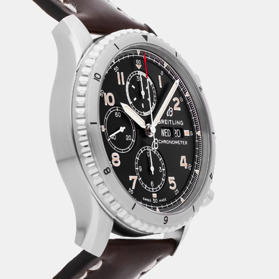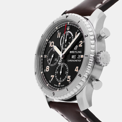 Breitling captures aviation heritage with the Aviator 8 A13316101B1X3, featuring a robust 43mm stainless steel case and automatic chronograph movement. Designed for precision and legibility, this pre owned timepiece blends sporty functionality with classic pilot watch aesthetics.