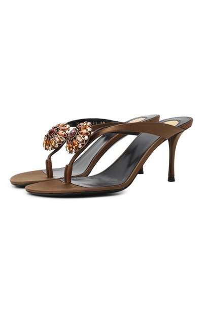 Мюли Otero с Y-образными ремешками украсили спереди крупными кристальными цветами. Пара на шпильке средней высоты изготовлена из атласа и отделана внутри кожей. На стельке в области пятки – круглая брендированная пластина.