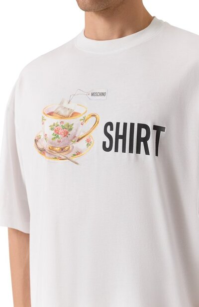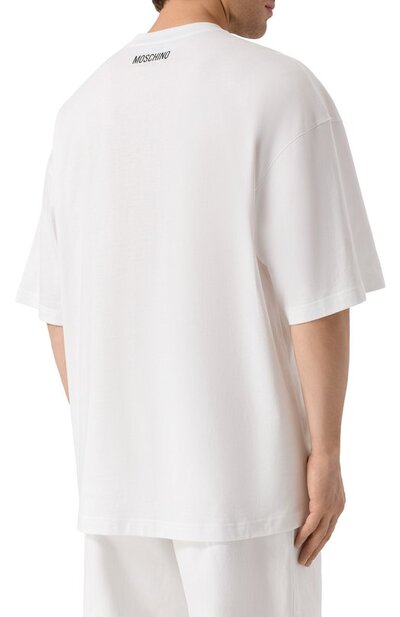 Свободную футболку со спущенной линией плеч выполнили из хлопкового джерси. Спереди модель украсили брендированным принтом, которому вторит контрастный логотип марки на спинке изделия.