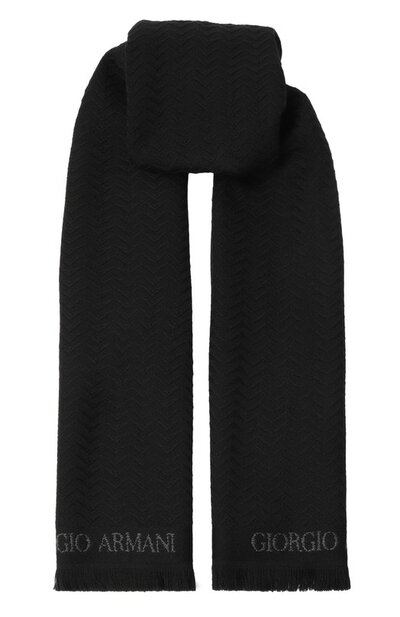 Для изготовления шарфа с жаккардовым шевронным узором в тон использовали шерсть первого пострига. Края модели украсили бахромой и брендированным паттерном.