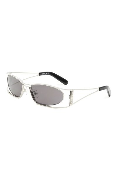 Солнцезащитные очки с фигурными деталями, продолжающими широкие дужки, изготовили из металла. Аксессуар с заушниками из ацетата дополнили овальными линзами, на 100% блокирующими UVA- и UVB-лучи.