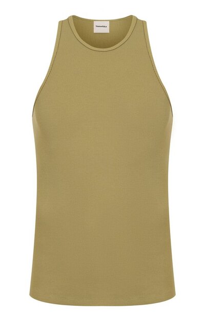 Майку Aleksy выполнили из ребристого трикотажа стрейч на основе переработанного и органического хлопка. Проймы и горловину изделия укрепили каймой в тон.