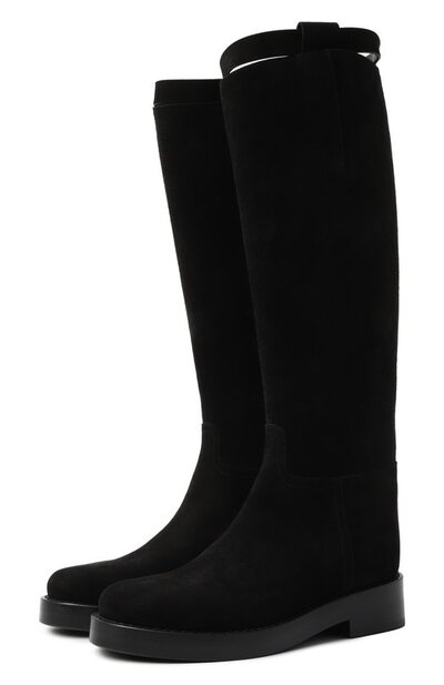 Жокейские сапоги Stan с кожаной подошвой и небольшим каблуком выполнили из замши. Пара с ремешком на высоком прямом голенище застегивается молнией сзади.