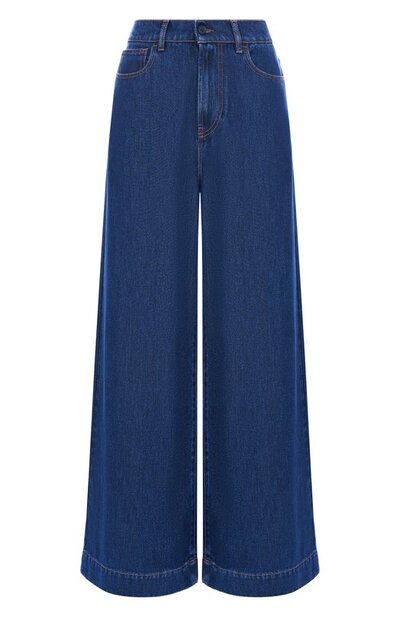Широкие расклешенные джинсы с пятью карманами выполнили из денима на основе лиоцелла. Сзади модель, прошитую строчкой табачного цвета, декорировали патчем с тисненым логотипом марки.