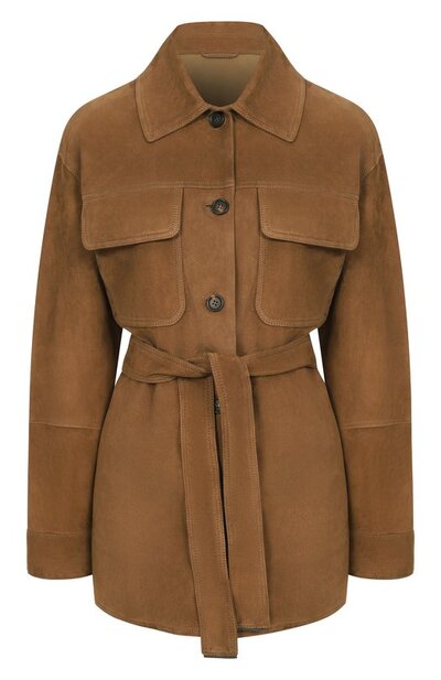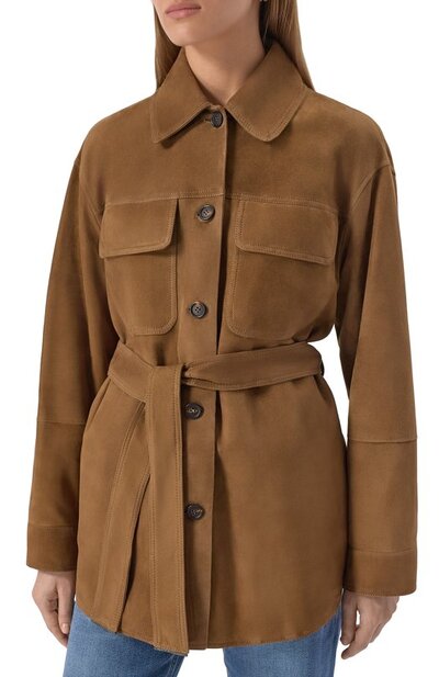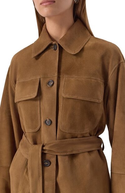 Куртку-рубашку из замши Couture дополнили крупными нагрудными карманами, а талию подчеркнули поясом-лентой. Модель с атласным подкладом, как и манжеты, застегивается пуговицами.