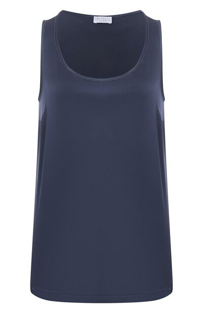 Топ с фигурным низом сшили из эластичного шелкового атласа. Круглую горловину и проймы модели подчеркнули знаковыми цепочками мониль.