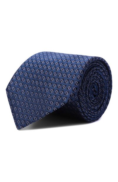 Галстук стандартной ширины выполнили из шелкового жаккарда с графичным узором. Аксессуар хорошо ложится в складки, держит узел и быстро расправляется после него без заломов.