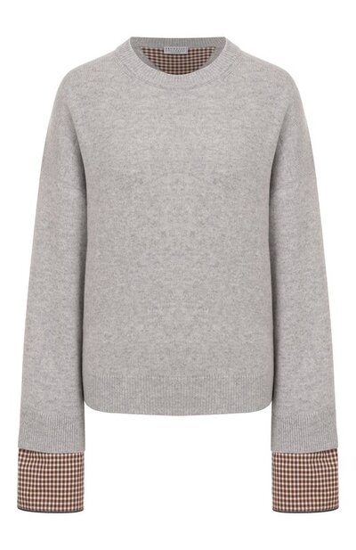 Меланжевый свитер со спущенной линией плеч связали из кашемировой пряжи. Эластичные манжеты продублировали съемными клетчатыми накладками, украсив их фирменной цепочкой мониль по краям.
