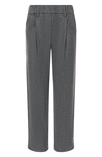 Меланжевые брюки baggy с эластичным поясом выполнили из фланелевого твила на основе шерсти первого пострига с добавлением кашемира. Один из пяти карманов модели украсили полосой, вышитой фирменными цепочками мониль.