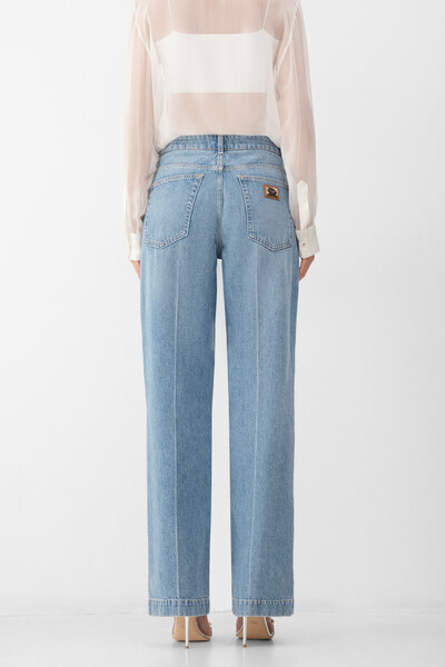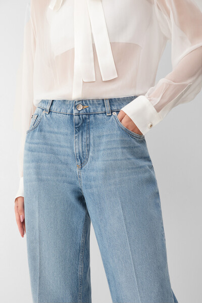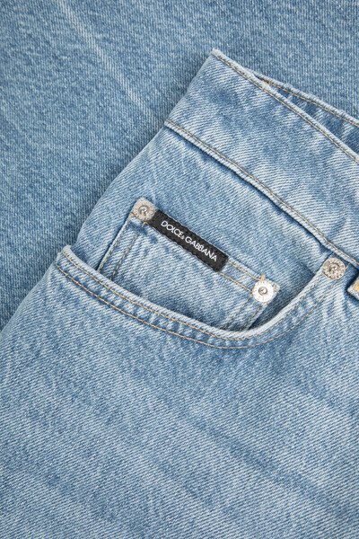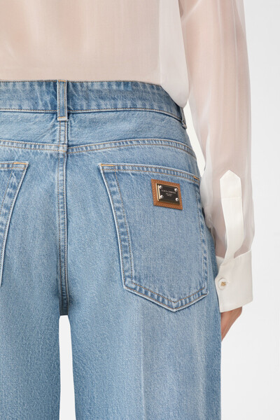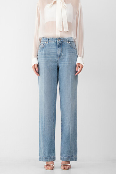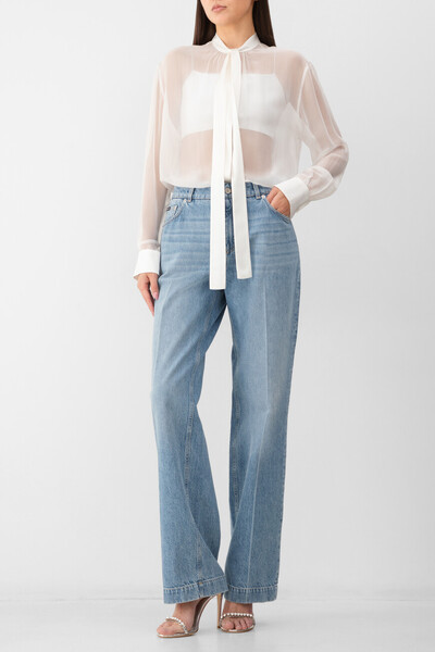Голубые джинсы Dolce&Gabbana свободного силуэта с дизайнерскими потёртостями. Бренд представляет новый способ интерпретации денима, создавая коллекцию, которая идеально подходит для любого стиля, объединяя женственность, современность и оригинальность. Модель с заутюженными складками выполнена из чистого хлопка с пятью традиционными карманами. Изделие с заниженной линией талии сочетается с твидовым жакетом и белоснежной рубашкой с бантом из той же коллекции.