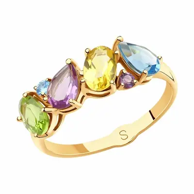 Кольцо из золота с полудрагоценными вставками. Изделие выполнено из красного золота 585 пробы. Характеристики: 1 Аметист Груша 6,00*4,00, 1 Аметист Круг 2,00, 1 Топаз Груша 6,00*4,00, 1 Топаз Круг 2,00, 1 Хризолит Овал 6,00*4,00, 1 Цитрин Овал 6,00*4,00