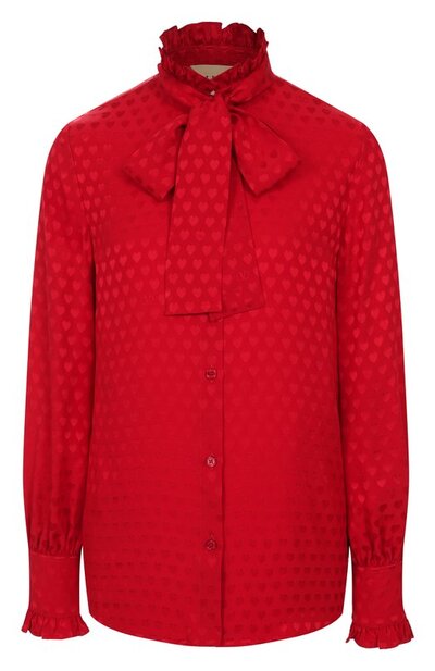 Блузу сшили из шелкового крепдешина с узором La Cour De Coeur. Воротник-стойку подчеркнули съемной лентой и небольшой оборкой, с которой перекликаются манжеты. Модель с плиссировкой на спинке застегивается пуговицами из перламутра в тон.