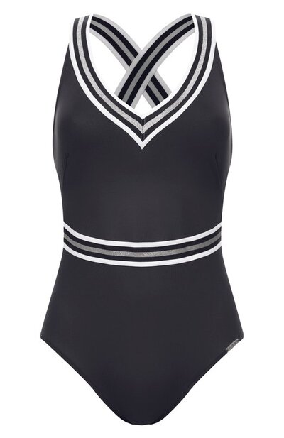 Слитный купальник из линии Energie Nautique сшит из микрофибры Lycra Sport с фактором защиты UPF 50. Широкие перекрещивающиеся бретели, пояс и V-образный вырез подчеркнуты полосками с люрексом. Модель украшена брендированной пластиной сбоку.