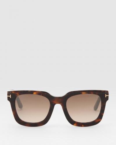 Солнцезащитные очки Tom Ford из ацетата в черепаховом узоре полностью блокируют ультрафиолетовые лучи. Широкая рамка и дужки украшены выгравированными полосами, заушники — логотипом бренда. Линзы дополнены миниатюрной монограммой Tom Ford. В комплект включили чехол с эмблемой.