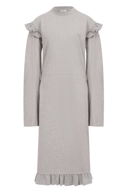 Отрезное по талии миди-платье с боковыми карманами выполнили из хлопкового трикотажа. Спереди вышили небольшой логотип в тон, а проймы и низ декорировали оборками.