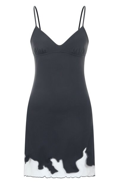 Короткое платье-комбинацию D-Inlay с регулируемыми бретелями изготовили из переработанного нейлона стрейч. Подол изделия украсили фигурной вставкой из тюля, а спинку модели дополнили пряжкой Oval D.