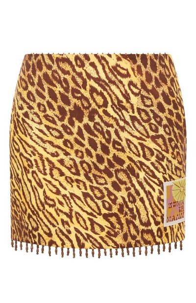 Мини-юбку с двумя боковыми карманами и потайной молнией сзади выполнили из хлопка с леопардовым узором. Спереди модель украсили брендированной нашивкой, а края подчеркнули бахромой из бусин.
