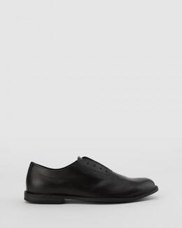 Дерби с миндалевидным мысом выполнили из гладкой кожи, отполированной до блеска. Модель установили на подошву с наборным каблуком и рифлеными резиновыми накладками.