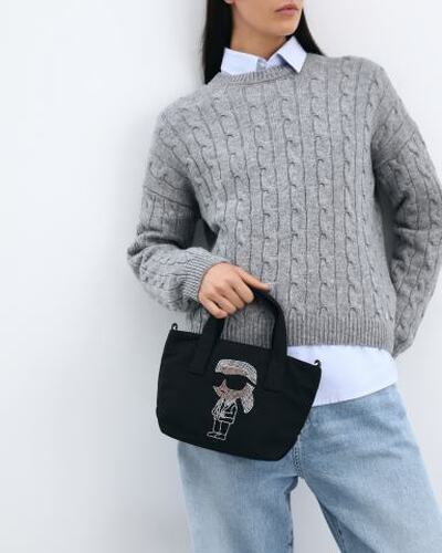 Сумка Karl Lagerfeld выполнена из органического хлопка. Благодаря двум ручкам сверху и съемному регулируемому ремню ее можно носить любым удобным способом. Модель украшена изображением Ikon Karl и стразами.