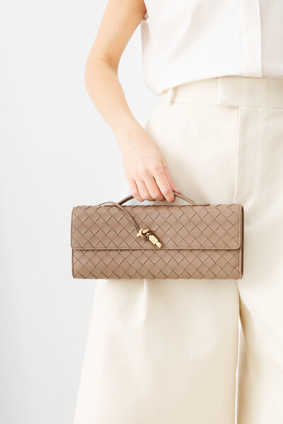 Клатч Andiamo от BOTTEGA VENETA выполнен в оттенке хаки. Изделие с просторным внутренним отделением сплетено в старинной технике «Intrecciato» из полос мягкой кожи ягнёнка. Чтобы модель можно было носить в руке, в верхней части предусмотрена округлая ручка. Аксессуар с шестью внутренними слотами для кредитных карт и плоским внутренним карманом закрывается замком в виде петли, в которую продевается стержень с декоративным узлом, закреплённый на узкую тесьму.