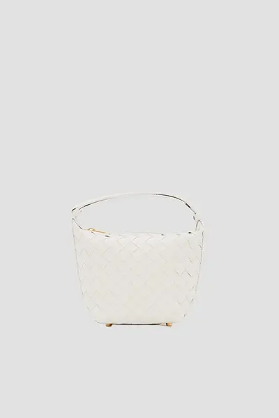 Белая сумка Wallace на молнии от Bottega Veneta. Для создания компактного аксессуара выбраны отрезы телячьей кожи, переплетённые между собой вручную в старинной «Intrecciato». Дно изделия защищено от царапин четырьмя металлическими пуклями, а боковые панели усилены гладкими накладками, которые плавно переходят в округлую регулируемую ручку с потайными клёпками для фиксации.
