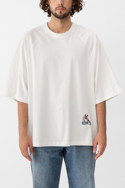 Футболка белого цвета от BOTTEGA VENETA. Для пошива изделия с прямым подолом используется мягкий хлопковый трикотаж. Спереди слева размещена разноцветная вышивка, добавляющая дизайну модели интересный штрих. Эта футболка является удобным предметом гардероба, сочетающим простоту и современный стиль.