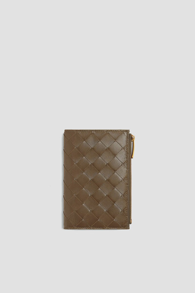 Кошелёк Bottega Veneta устойчив к появлению потёртостей и царапин. Всё благодаря материалу: для производства компактного аксессуара прямоугольной формы используется мягкая кожа наппа в оттенке хаки. Внешние стороны модели сплели в знаковой для бренда технике «Intrecciato»: фетуччи продели в уже подготовленное полотно с прорезями, сформировав графичный шахматный узор.
