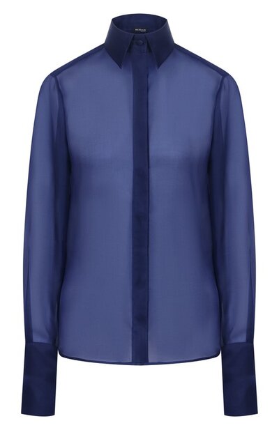 Рубашку с фигурным низом выполнили из полупрозрачной шелковой органзы. Модель с супатной застежкой дополнили отложным воротником и широкими манжетами из гладкого атласа.