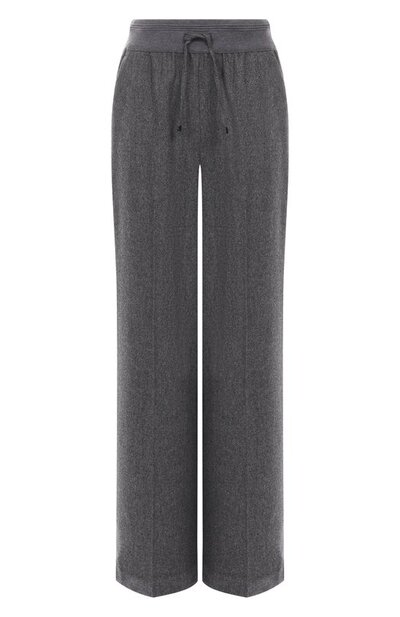 Широкие брюки со стрелками выполнили из тонкой шерстяной ткани. Модель с боковыми карманами и поясом-кулиской из трикотажа в рубчик декорировали сзади фирменной миниатюрной звездой.