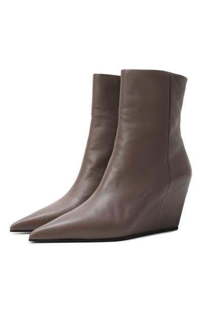 Ботильоны с заостренным мысом и высокой обтянутой танкеткой сшиты из мелкозернистой кожи. Модель без декора застегивается потайной молнией сбоку.