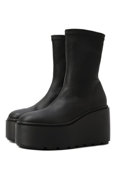 Ботильоны с круглым мысом и коротким голенищем сшиты из эластичной кожи. Модель с текстильным подкладом дополнена массивной, но легкой платформой с рельефным протектором.