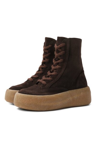 Ботинки с круглым мысом и кожаным подкладом выполнили из замши. Модель с вязаными шнурками и широкой вулканизированной подошвой застегивается молнией сбоку.