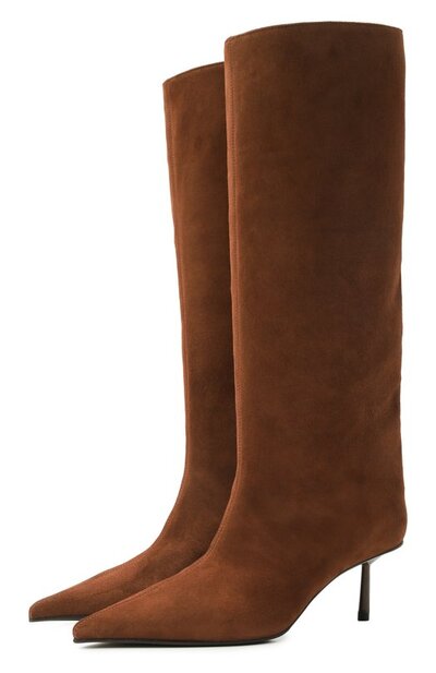 Сапоги Bella с зауженным мысом, акцентированным швом, выполнили из телячьей замши, а внутреннюю отделку — из наппы. Пара с прямым голенищем обходится без застежки.