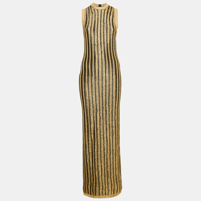 Tom Ford’s rib knit maxi dress is designed in black and gold Lurex with a slinky crewneck silhouette. Glamorous yet understated, it hugs the body with metallic sheen and refined ease. Ideal for evening events where texture and shine take center stage.