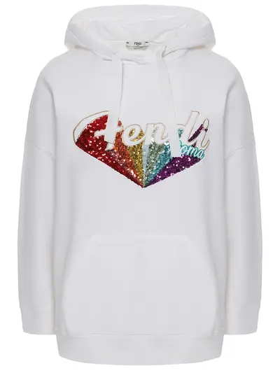 -Модель свободного кроя со спущенной линией плеча, длинными рукавами, капюшоном на кулиске, накладным карманом-кенгуру спереди, вышитым логотипом бренда и декором пайетками на груди.