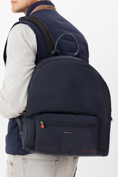 Рюкзак Kiton сшит из тонкого тёмно-синего текстиля. Вместительный аксессуар оснащён просторным внутренним отделением на встречной молнии с двумя брендированными пуловерами. Модель также дополнена одним внешним карманом на молнии спереди, тремя плоскими внутренними карманами, два из которых прорезные на молнии, а третий накладной на кожаном ремешке, а также двумя держателями для ручек. Функционал изделия расширен ремешком-креплением на телескопическую ручку чемодана на задней стенке.