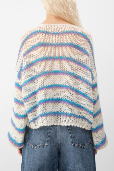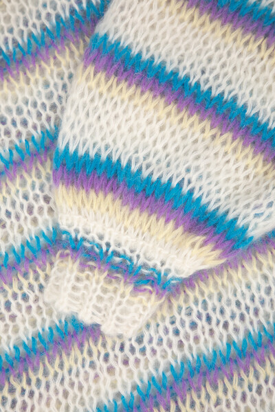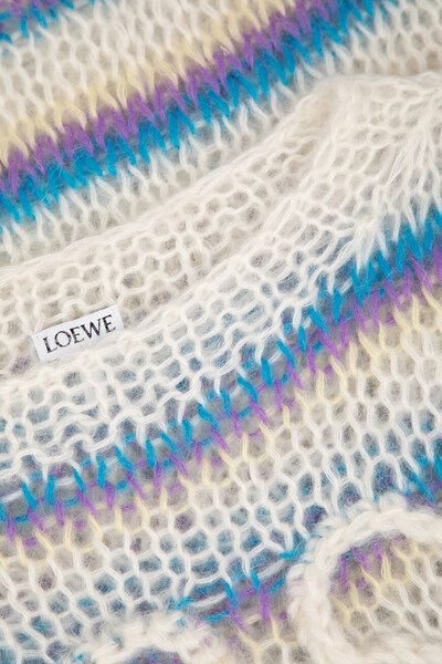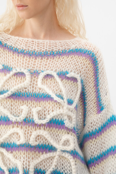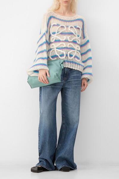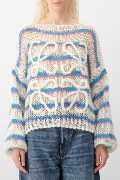 Полосатый свитер белого цвета от LOEWE. Для изготовления изделия расслабленного силуэта используется пряжа на основе мягкой шерсти, прочного нейлона и мохера средней плотности. Поверхность модели средней длины покрыта горизонтальным двухцветным мотивом. Спереди размещены четыре дизайнерские литеры «L», вывязанные белой нитью - крупная анаграмма, отсылающая к Дому. Для создания органичного образа в стиле casual носите свитер с джинсами из той же коллекции.