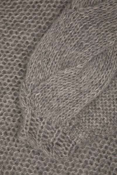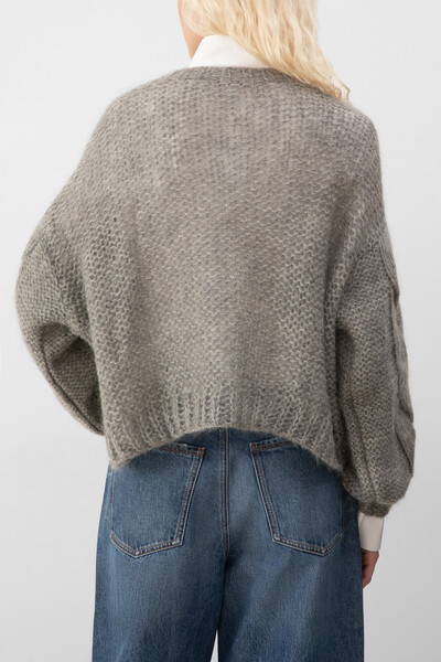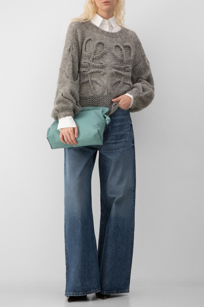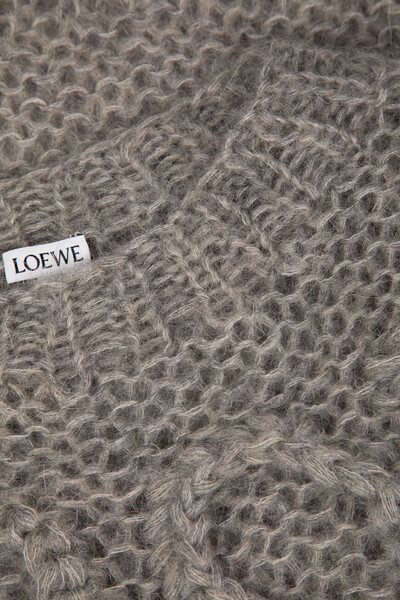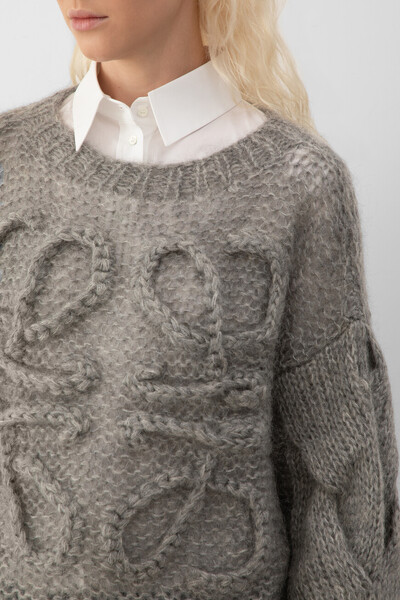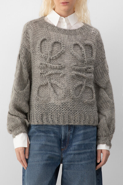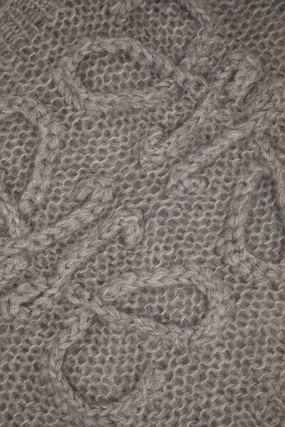 Серый свитер расслабленного силуэта от LOEWE. Для производства вязаного изделия выбраны мягкая шерсть, прочный нейлон и мохер средней плотности. Спереди расположены четыре вывязанные литеры «L» - культовая рельефная анаграмма Дома ручной работы. Конструкция модели характеризуется спущенной линией плечевого шва и наличием длинных рукавов-фонариков с крупным узором «косы» в нижней части по бокам.
