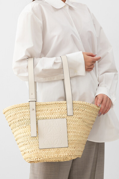 Сумка-корзина Basket от LOEWE выполнена из плетёной вручную рафии нейтрального оттенка. Листья материала выращиваются, собираются, высушиваются на солнце и обрабатываются потомственными мастерами из Марокко. Вместительный аксессуар оснащён одним просторным внутренним отделением и украшен кожаной нашивкой с крупными тиснёными лого и анаграммой Дома, расположенной на лицевой стенке.