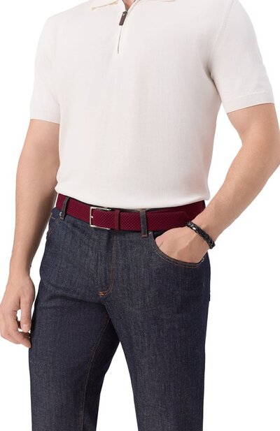 Ремень с плотной внутренней отделкой выполнили из трикотажа с фактурным узором. Пряжку закрепили накладкой из замши в тон, изготовив из такого же материала нескользящую шлевку.