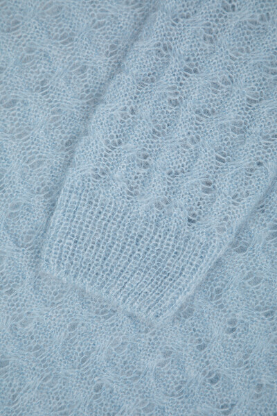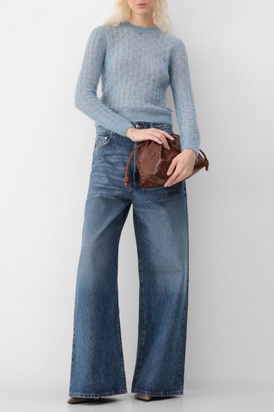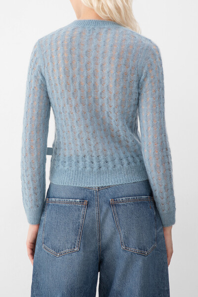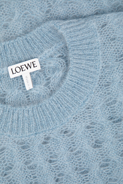 Ажурный свитер фактурной вязки «косы» от LOEWE. Модель изготовлена из лёгкой пряжи на основе шерсти, мохера и прочного эластичного нейлона голубого оттенка. Для оптимальной посадки изделия средней длины по фигуре в нём предусмотрены широкий эластичный пояс и манжеты-резинки.