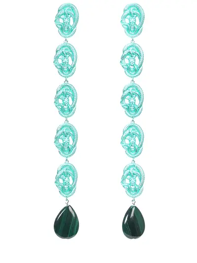 -Зеленые удлиненные серьги из бижутерного сплава от CAVIAR JEWELLERY. -Модель выполнена из латуни с декором фактурной нанокерамикой и малахитом. -Модель с застежкой-пусет выглядит дорого и дополнит повседневные или вечерние образы.