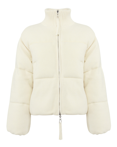 Эта шерстяная куртка представляет собой прекрасное сочетание комфорта и современного дизайна. Её мягкий, кремовый оттенок создаёт атмосферу уюта и легкости, идеально подходя для осенне-зимнего гардероба. Куртка отличается объемным силуэтом, который обеспечивает свободу движений и универсальный стиль. Рельефная структура ткани добавляет глубину и текстуру, придавая изделию уникальный визуальный эффект. Воротник-стойка выполнен из эластичного материала с ребристой отделкой, который не только защищает от ветра, но и акцентирует внимание на линии шеи. Центральная застёжка на молнии снабжена декоративным пулером, что добавляет функциональности и стильного акцента. Качественная простёжка делает дизайн ещё более интересным и обеспечивает равномерное распределение тепла. Внутренняя подкладка заботится о комфорте и сохраняет ощущение уюта при носке. Эта куртка станет идеальной частью вашего гардероба, привнося в него нетривиальность и элегантность, а также обеспечивая уютное тепло в прохладные дни.