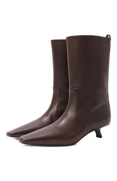 Полусапоги с квадратным мысом, на скошенном каблуке kitten heel изготовили из зернистой кожи. Голенище дополнили петлей, расшитой фирменной цепочкой мониль.